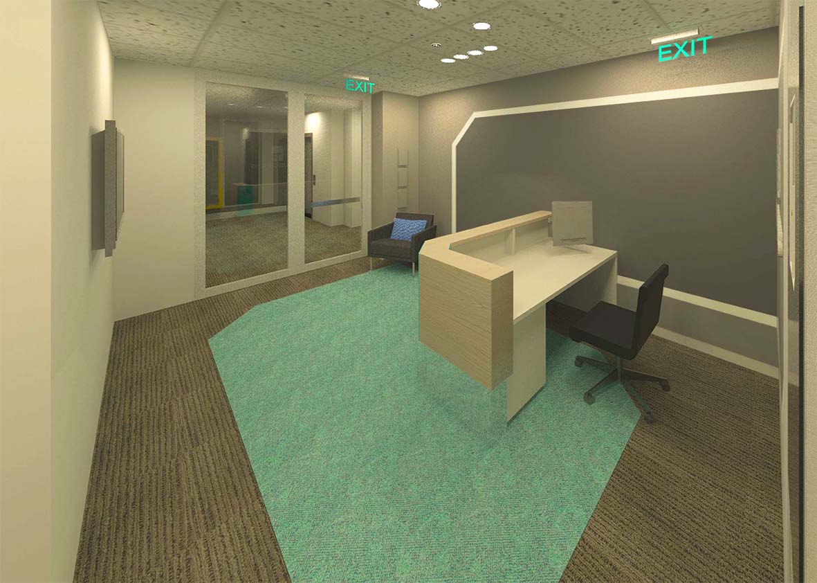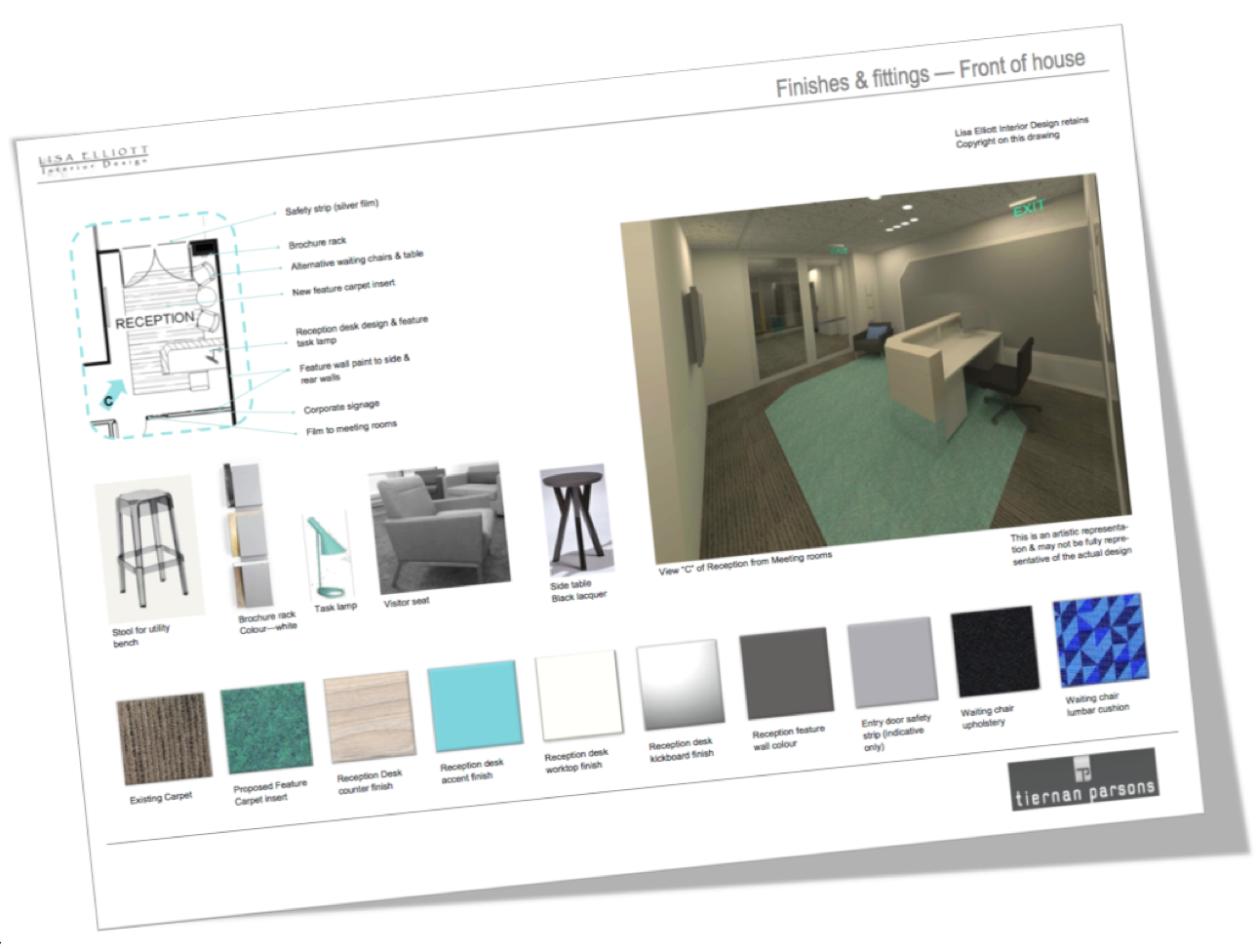 A modest budget for the front of house area set a challenge for the designer to transform the tiny entry into a bespoke greet & meet area with plenty of visual impact. Although the firm does not have regular visitors, they do have a need for a meeting & conference facility, providing presentations for 30 visitors. Our strategy was to provide a simple yet visually enticing design that would be instantly recognisable and used to reinforce the Tiernan Parsons brand. As the reception area is very compact, the counter was designed as low & small as practicable, whilst still catering to all the needs of the receptionist. The design is simple yet playful, with warm timber tones and a hint of the bright teal corporate colour. The client’s main request in the briefing process was for a feature wall behind reception; tones of grey and white paint was used to re-create the graphic elements of the firm’s logo on a large scale to reinforce the brand, and wrap around the small rear wall to create the illusion of a larger element. The designer’s suggestion to replace some of the existing carpet with a feature teal carpet tile, draws the visitor’s attention from the lobby area, and further underlines the brand graphics.
