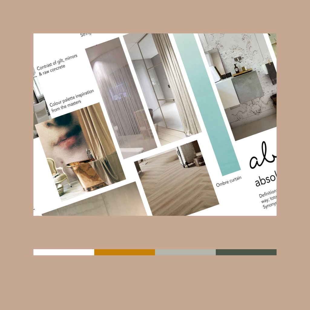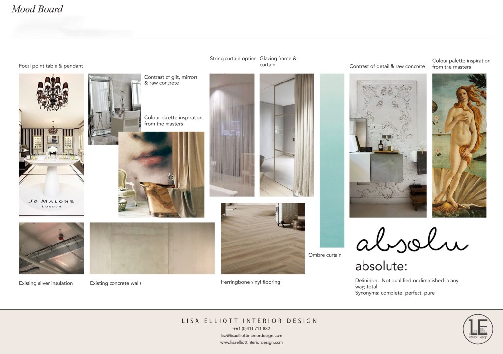 The Moodboard below explores ideas of incorporating the existing concrete walls & exposed services with a classic interior: herringbone timber look vinyl flooring, wallpaper, curtaining ideas for the wash basin area & lighting with a wow-factor. It gives a glimpse of the final project to make sure we’re all on the same page before moving forward into Concept Design.