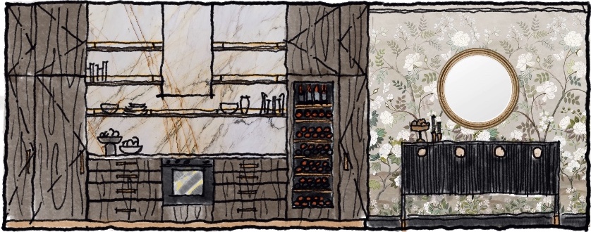 The sketch below is an example of cabinetry at the Concept Design stage (depending upon if it’s needed for your project). This is then translated into a fully drafted joinery package, dimensioned set of drawing with plans, elevations, sections, and details. Outlining the construction method & details, and all the finishes, fixtures, appliances.