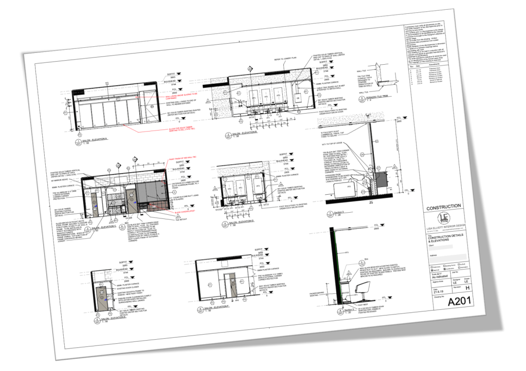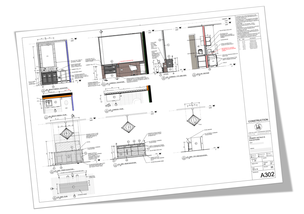 During the Detailed Design Development and Documentation, we work closely with consultants like your project manager, services engineer, structural engineer, architect, building surveyor, other specialists & your builder to coordinate the interior design with the engineering services & structural elements, egress and accessibility, among a myriad of other details.
