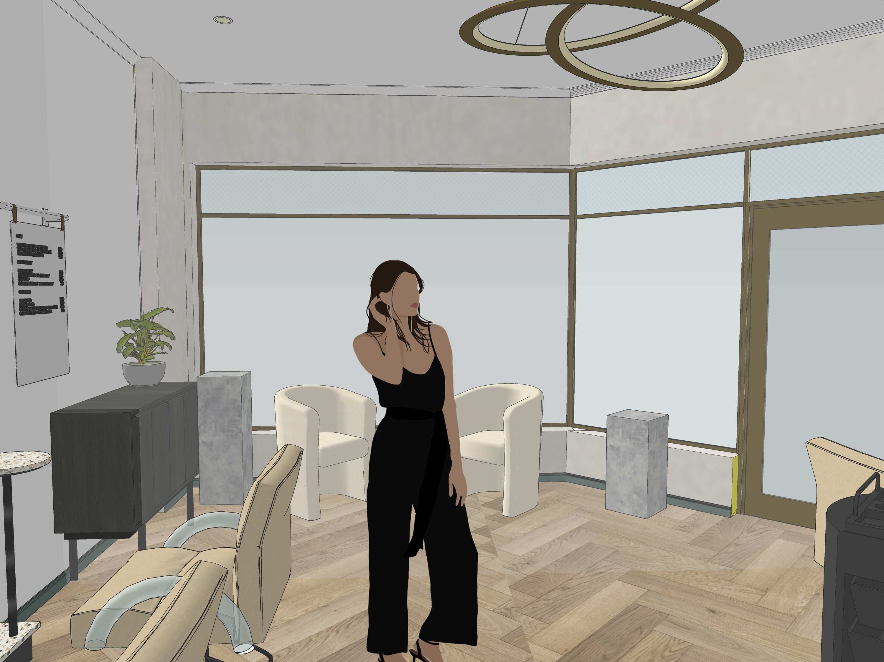 The open salon is characterised by its arched openings and furnishings, which create a sense of organic flow and openness between different areas of the space.