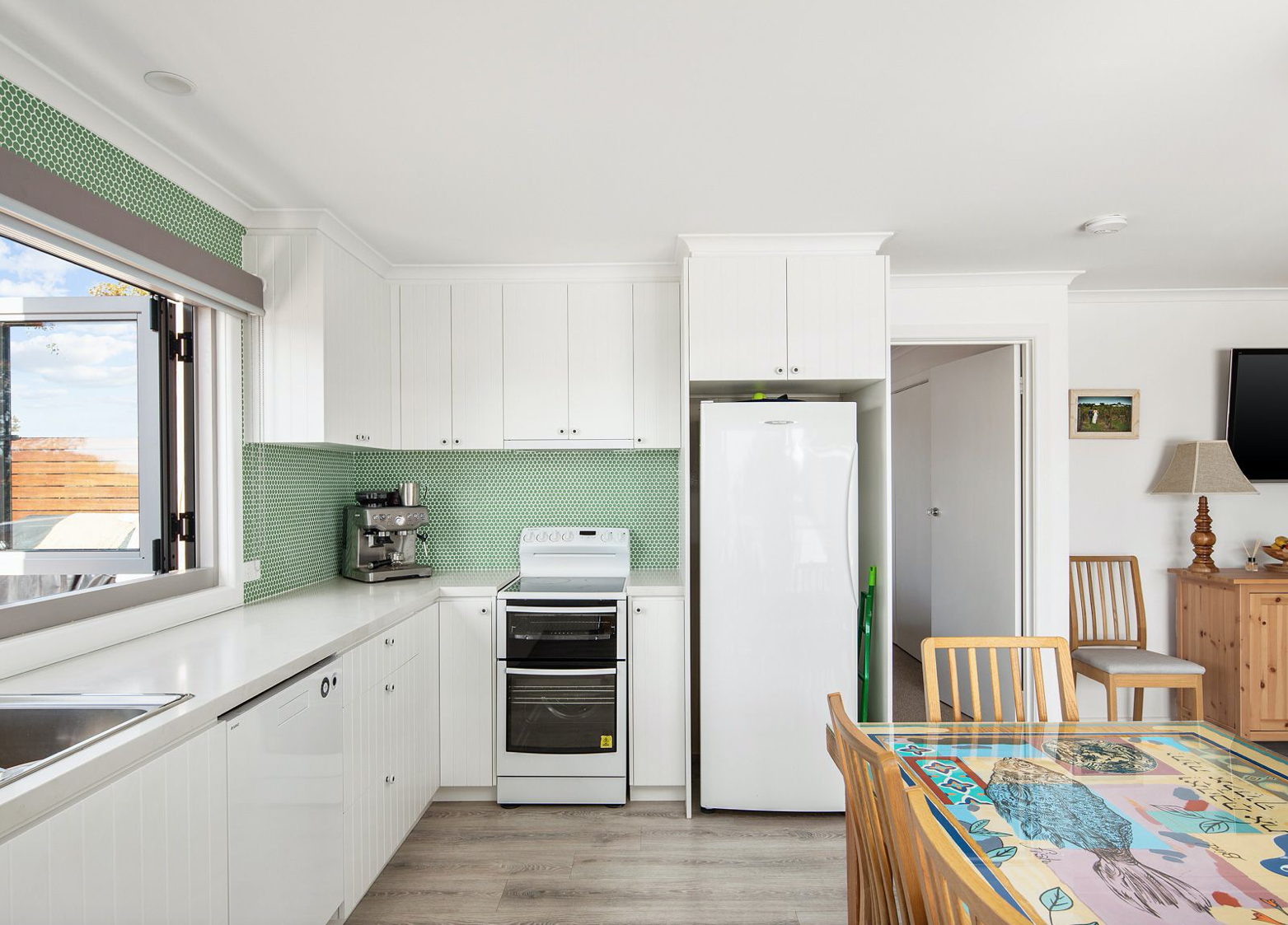 Having designed my client’s Melbourne home, I had already established a familiarity with their likes and dislikes; feature mosaic tiles were used in the bathroom and kitchens pared with natural timber-look vinyl, marble-like quartz bench tops and neutral white wall tiles.