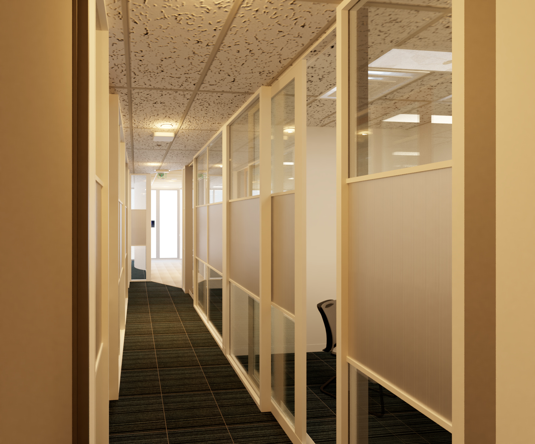 The central corridor with office on both sides has full height glazing with sliding doors to make the most of the limited space, and feature film strips for privacy. All while maintaining wheelchair & accessibility in all the areas.